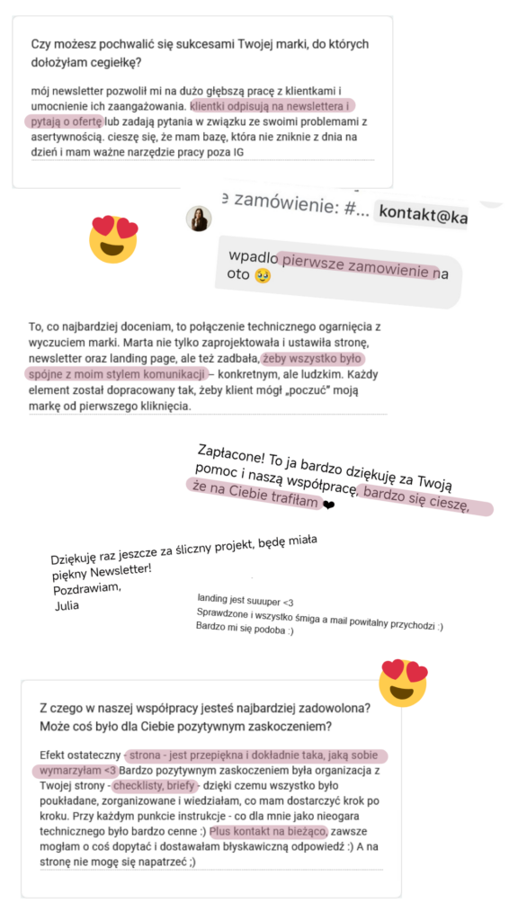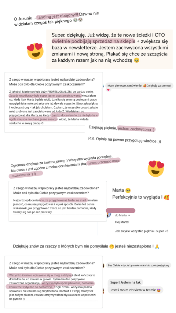 Współpracując ze mną, nie dostajesz tylko technicznego wdrożenia – dostajesz wsparcie partnerki biznesowej, która myśli strategicznie, zna realia prowadzenia biznesu online i nie boi się wdrażać rozwiązań, które zaprocentują w Twoim biznesie.